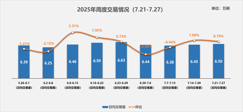中国汽车流通协会发文称,2025年7月21日至27日东莞股票配资平台官网,二手车市场表现稳健,日均交易量6.50万辆,环比增0.79%,虽较6月同期降1.9%,但自7月第二周起交易量便逐周小幅攀升。这得益于暑期消费格局的显现,以及汽车置换更新政策推动下,行业置换率稳定在60%以上,大量二手车进入市场,为后续提供了充足车源。7月1日至27日累计交易148万辆,预计全月交易量165万辆左右,与6月持平。