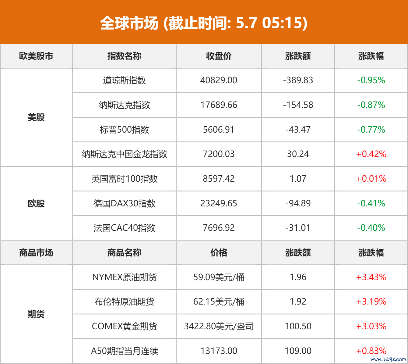 国内期货:5月6日,国内商品期货多数收跌,原油、燃料油、硅铁跌超3%,焦煤、锰硅、工业硅跌近3%,鸡蛋、甲醇、多晶硅跌超2%。涨幅方面,20号胶涨超2%,尿素、烧碱涨近2%。