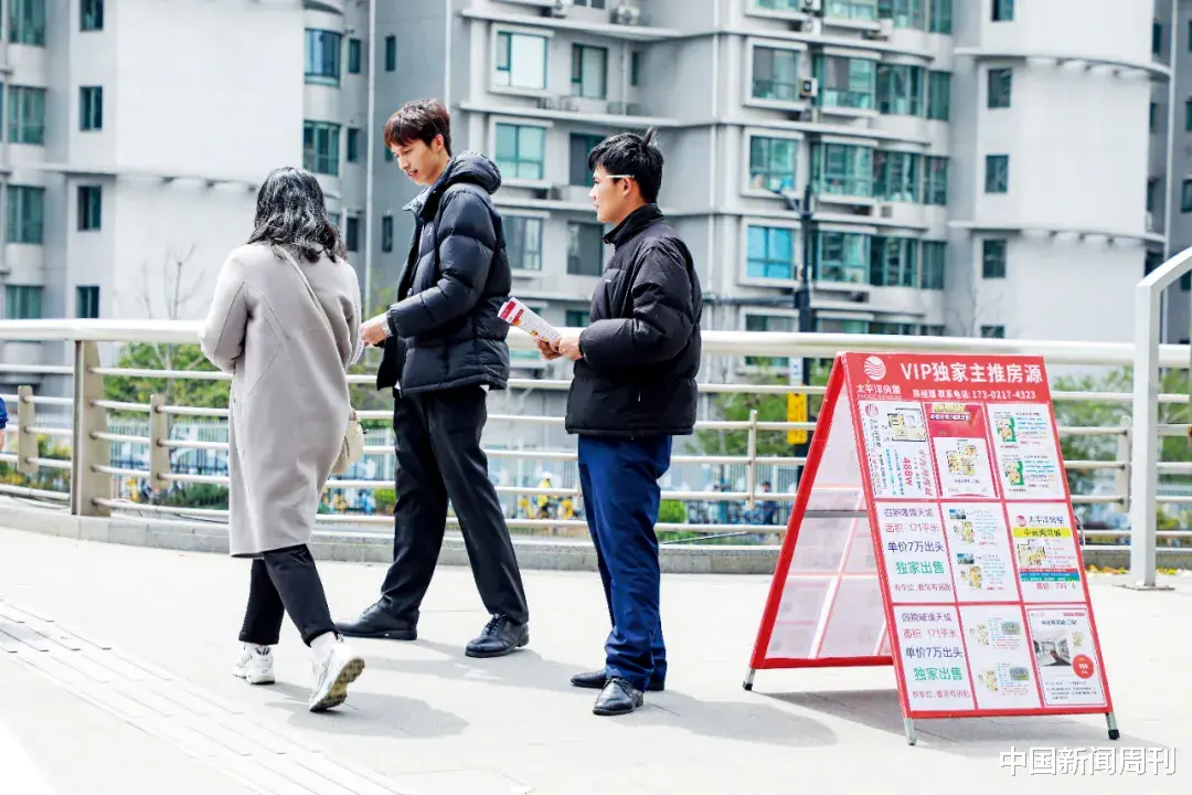 2025年4月,上海一房产中介的工作人员走上街头推销二手房。本文图/视觉中国