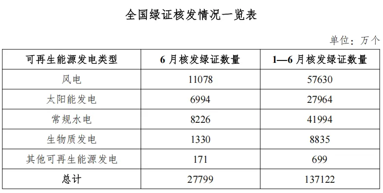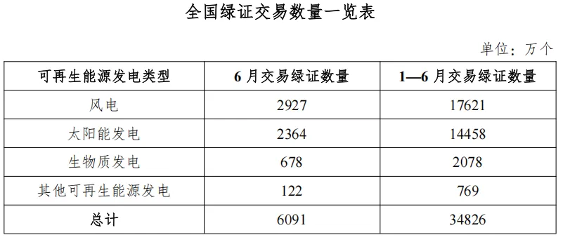 7月31日,国家能源局发布2025年6月全国可再生能源绿色电力证书核发及交易数据。